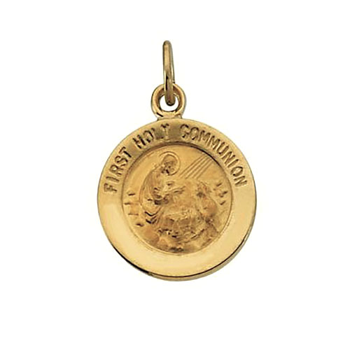 This round First Communion medal is made of polished 14kt yellow gold medal. 12mm diameter. Inscription reads: FIRST HOLY COMMUNION. Weighs 0.81 grams. The Sacrament of the Body and Blood of Jesus. These medals celebrate receiving Jesus for the first time. Please note: weight is approximate, actual weight may vary. Chain not included.
