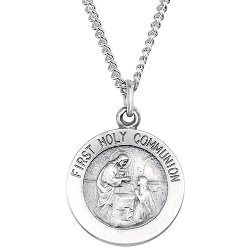 This small sterling silver first holy communion medal dangles from a 18-inch sterling silver curb chain. Round, 15mm diameter. Inscription reads: FIRST HOLY COMMUNION. Weighs 4.46 grams. The Sacrament of the Body and Blood of Jesus. These medals celebrate receiving Jesus for the first time. Engravable on the back.