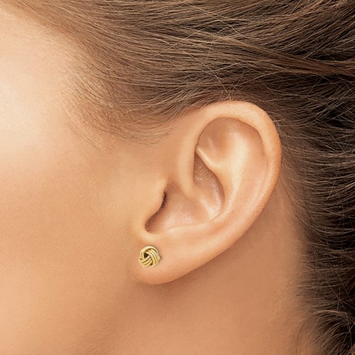 These mini triple ridge love knot earrings are made of 14k yellow gold. Dimensions: 6.4mm x 6.5mm. Hollow. Posts with push on / pull off backs. Weight: 0.5 grams. Made in Spain. Ships from USA.