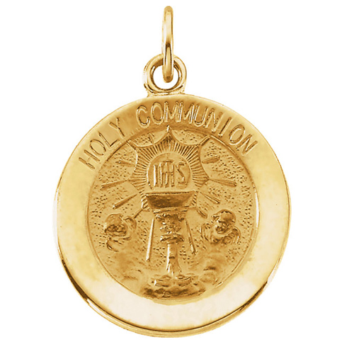 The Sacrament of the Body and Blood of Jesus. These medals celebrate receiving Jesus for the first time. Polished 14kt yellow gold medal. Round, 15mm diameter. Inscription reads: HOLY COMMUNION. Weighs 1.26 grams. Please note: weight is approximate, actual weight may vary. Chain not included. Bail dimensions: 1.9mm x 1.75mm. We recommend a chain no wider than 1.5mm.