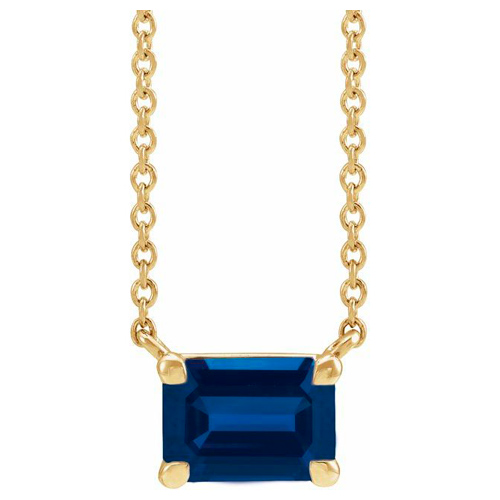 14k yellow gold emerald-cut created blue sapphire necklace has a spring ring clasp. Four claw prongs. 5mm x 3mm emerald-cut created blue sapphire, gem quality, .37 carat total weight. 14k yellow gold cable chain length: 18in, width: 1mm. Item weight: 1.6 grams. Made in USA.