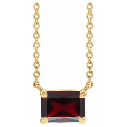 14k yellow gold emerald-cut garnet necklace has a spring ring clasp. Four claw prongs. 5mm x 3mm emerald-cut Mozambique garnet AA quality, .40 carat total weight. 14k yellow gold cable chain length: 18in, width: 1mm. Item weight: 1.6 grams. Made in USA.