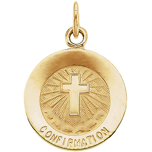 This very small Confirmation medal is made of solid 14k yellow gold. Round, 12mm diameter. Inscription reads: CONFIRMATION. Fits up to a 2mm wide chain. Weighs 0.79 grams. Die struck. Made in USA.