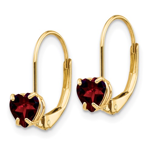 1.1 carat total weight genuine heart garnet leverback earrings are made of 14k yellow gold. 5mm heart garnet. Earring total length: 5/8in. Weight: 0.8 grams. Made in India. Ships from USA.
