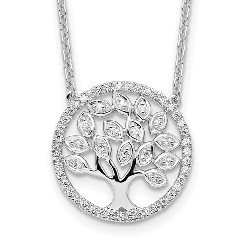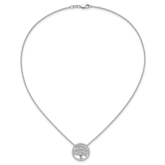 This 14k white gold .29 ct tw lab grown diamond tree of life necklace has a lobster clasp. 14k white gold 18 inch cable chain. Diamond details: lab grown round full cut diamonds, SI1-SI2 clarity, G-H color. Pendant size: 3/4in. Approximate weight: 4.3 grams. Made in India. Ships from USA.