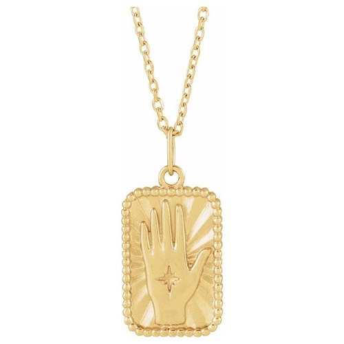This small hamsa hand tarot necklace is made of solid 14k yellow gold. Pendant size: 3/8in x 3/4in. 14k yellow gold adjustable 16 to 18in cable chain has a lobster clasp. Chain width: 1mm. Weight: 3.4 grams. Please note: weight is approximate, actual weight may vary. Made in the USA.