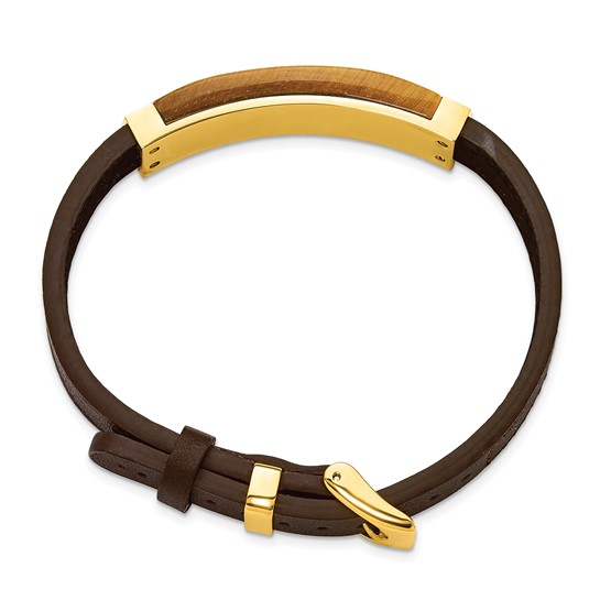 This men's tiger eye brown leather bracelet has yellow ion-plated 316L stainless steel bar accents. Bracelet lengh is adjustable from 7 inches to 9 inches. Bracelet width: 1/2in. Buckle closure. Approximate weight: 21.4 grams. Made in China. Ships from USA.