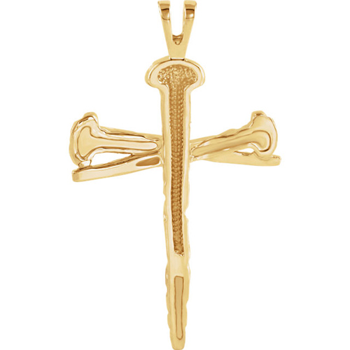 Nails cross pendant is made of polished 14k yellow gold. Item size: 26mm x 18.25mm. This cross is slightly larger than a quarter. Fits up to a 3.25mm wide chain. Weighs 3.36 grams. Please note: weight is approximate, actual weight may vary. Chain not included. Part of the Crown of Thorns collection by Brad Ferguson.