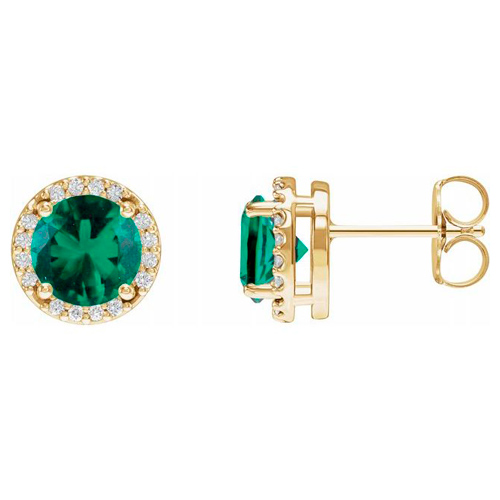 Round created emerald and diamond halo earrings are set in solid 14k yellow gold. Gemstone details: two 4mm round lab created emeralds, gem quality. Each created emerald weighs 0.5 carats. .05 carat total weight genuine diamond accents, I1 clarity G-H color. Earring dimensions: 6mm x 6mm. Approximate weight: 1.0 grams. Please note: weight is approximate, actual weight may vary.