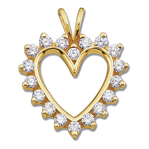 Solid 14k yellow gold heart shaped pendant has diamonds along its border. Diamond details: 18 .05CT full cut round faceted diamonds. Prong set. Diamond clarity I1, color G-H. Weighs 3.44 grams. Please note: weight is approximate, actual weight may vary. Chain not included.