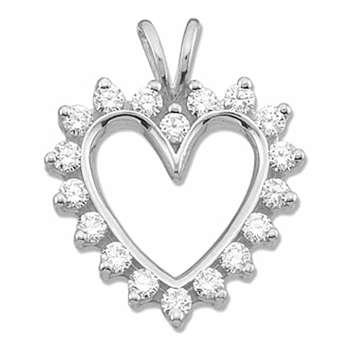 Heart shaped pendant is made of polished solid 14k white gold with diamonds along its border. Diamond details: 18 .05CT full cut round faceted diamonds. Prong set. Diamond clarity I1, color GHI. Weighs 3.44 grams. Please note: weight is approximate, actual weight may vary. Chain not included.