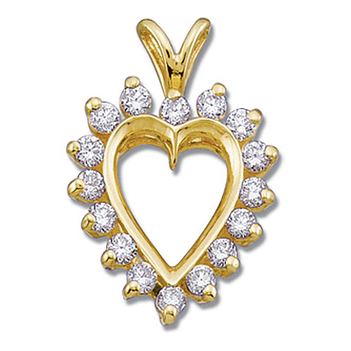 1/2 carat total weight diamond heart pendant is made of polished 14kt yellow gold. Diamond details: 16 .03CT full cut round faceted diamonds. Prong set. Diamond clarity I1, color GHI. Weighs 1.16 DWT (1.81 grams). Please note: weight is approximate, actual weight may vary. Chain not included.