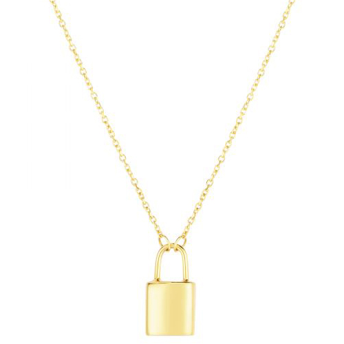 This slender lock necklace is made of solid 14k yellow gold. Pendant height: 1/2in. 14k yellow gold 18in cable chain has a lobster clasp. Approximate weight: 2.1 grams. Made in Turkey. Ships from USA.
