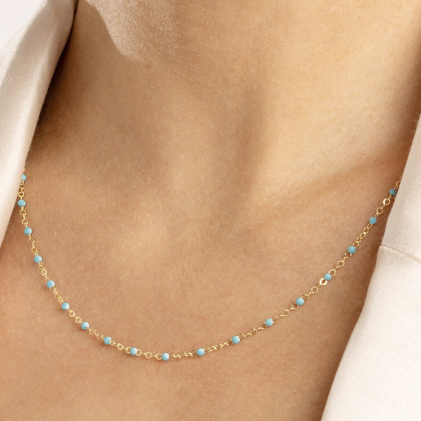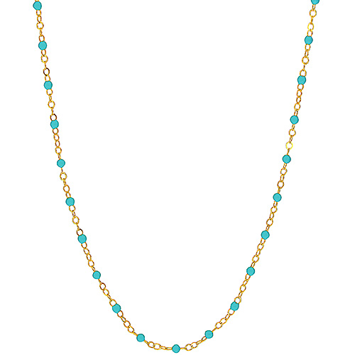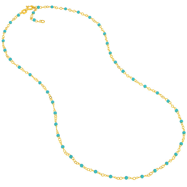 14k yellow gold turquoise enamel bead necklace has a spring ring clasp. Piatto link chain. Necklace adjustable length: 17-18 inches. Two jump rings for adjustable length. Approximate weight: 1.5 grams. Made in Turkey. Ships from USA.