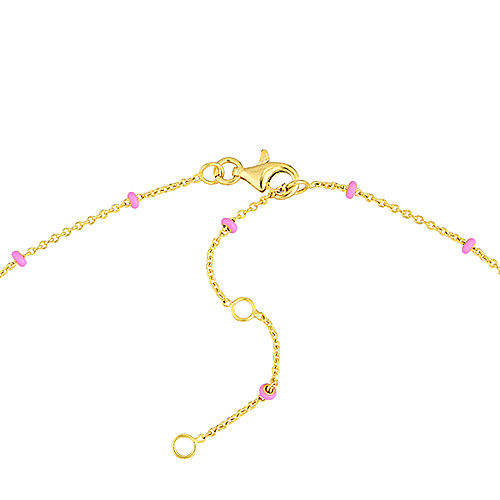 14k yellow gold saturn chain necklace has pink enamel bead charms. Adjustable in length from 16 to 18 inches. Lobster clasp. Approximate weight: 2.8 grams. Made in Turkey. Ships from USA.