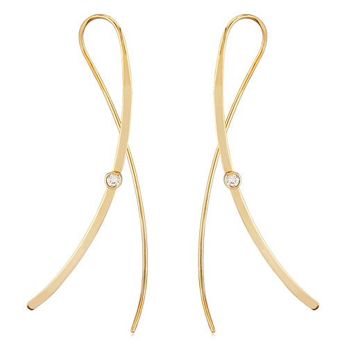 14k yellow gold crossover threader earrings have two round diamond accents. Earring drop length: 1.8 inches. Diamond details: .06 carat total weight, two round full cut diamonds, SI3 clarity, G-H color. Item weight: 1.4 grams. Made in the USA.