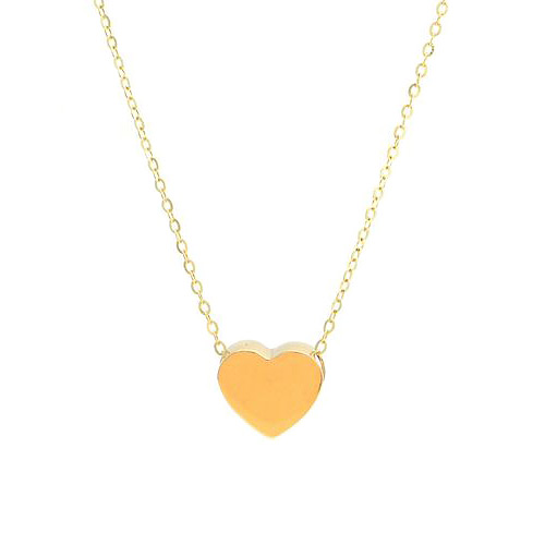 This mini 14k yellow gold flat heart pendant dangles from a 14k yellow gold 16-18in cable chain with spring ring clasp. Heart size: 8.6mm. The heart does not slide on the chain. Open back. Made in China. Ships from USA.
