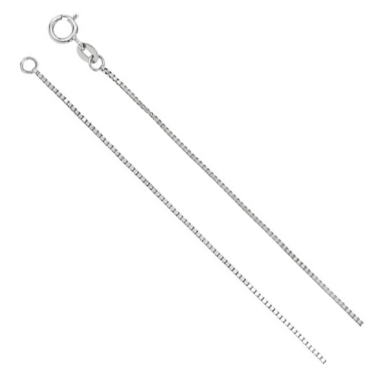 Polished 14kt white gold 20in box chain has a spring ring clasp. Width: 0.75mm. Weighs 2.30 grams. Please note: weight is approximate, actual weight may vary.