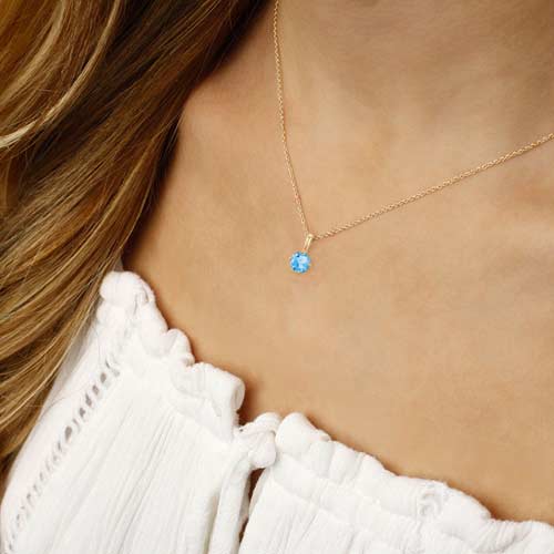 1/3 carat genuine round sky blue topaz solitaire necklace is made of 14k yellow gold. 14k yellow gold 18in loose rope chain has a spring ring clasp. Chain width: 0.6mm. One genuine round 4mm faceted sky blue topaz, AA quality. Four prong setting. Approximate weight: 0.8 grams. Made in USA.