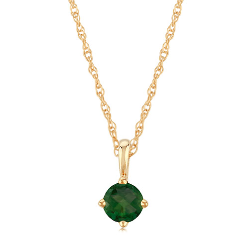 1/4 carat genuine round emerald solitaire necklace is made of 14k yellow gold. 14k yellow gold 18in loose rope chain has a spring ring clasp. Chain width: 0.6mm. One genuine round 4mm faceted emerald, A quality. Four prong setting. Approximate weight: 0.8 grams. Made in USA.