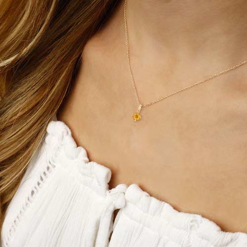 1/4 carat genuine citrine solitaire necklace is made of 14k yellow gold. 14k yellow gold 18in loose rope chain has a spring ring clasp. Chain width: 0.6mm. One genuine round 4mm faceted ctirine, AA quality. Four prong setting. Approximate weight: 0.8 grams. Made in USA.