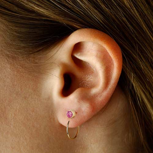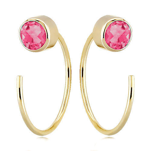 14k yellow gold pink tourmaline hoop threader earrings have an elegant bezel setting and polished finish. Two 4mm genuine round pink tourmalines, 1/2 carat total weight, A quality. Earring size: 1/2in x 1/2in. Approximate weight: 0.7 grams. Made in USA.