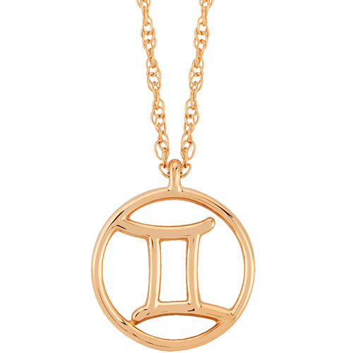 This small 14k yellow gold Gemini zodiac sign necklace has a round border and polished finish. Pendant size: .45in. 14k yellow gold 18 inch loose rope chain has a spring ring clasp. Made in USA.