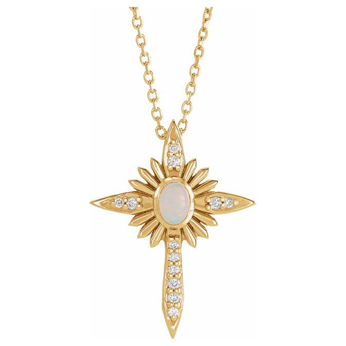 n14k yellow gold Nativity cross necklace has a genuine white oval opal surrounded by diamond accents. 14k yellow gold 16in to 18in adjustable diamond-cut cable chain has a spring ring clasp. 4mm x 3mm Australian white opal. Diamond details: 12 round full cut diamonds, 0.06 carat total weight, I1 clarity, G-H color. Approximate weight: 3.1 grams. Made in USA.