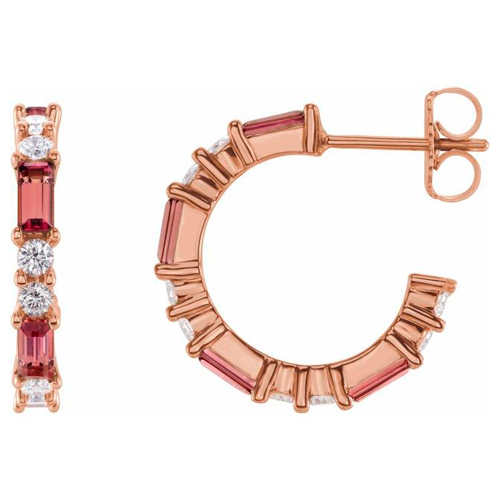 Straight baguette cut pink tourmaline and round diamond hoop earrings are made of 14k rose gold. C-shaped hoops. Eight genuine straight baguette cut pink tourmaline gemstones, 4mm x 2mm, AA quality. Earring diameter: 17mm, thickness: 2.6mm. Posts with push on / pull off backs. Approximate weight: 3.3 grams.