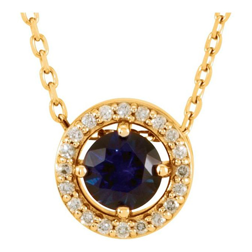 0.70 carat round lab grown blue sapphire and diamond halo pendant is made of 14k yellow gold. 14k yellow gold 16in cable chain has a spring ring clasp. Gemstone details: lab grown blue sapphire, 5mm, gem quality. .06 ct tw genuinie natural diamond accents, I1 clarity, G-H color. Apprroximate weight: 2.0 grams. Please note: weight is approximate, actual weight may vary.