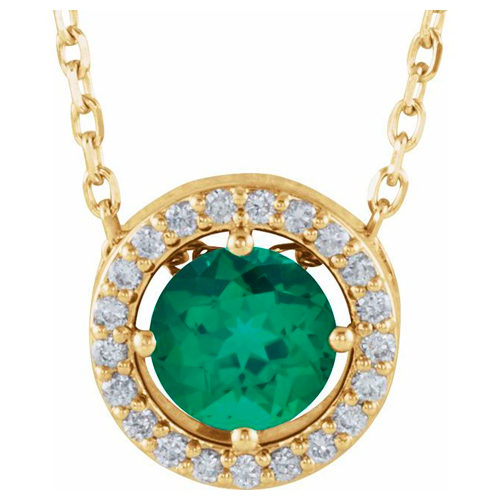 0.50 carat round lab grown emerald and diamond halo pendant is made of 14k yellow gold. 14k yellow gold 16in cable chain has a spring ring clasp. Gemstone details: lab grown emerald, 5mm, gem quality. .06 ct tw genuinie natural diamond accents, I1 clarity, G-H color. Apprroximate weight: 2.0 grams. Please note: weight is approximate, actual weight may vary.