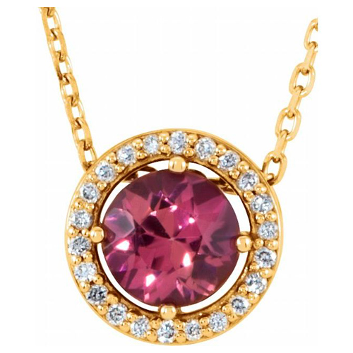 0.55 carat round pink tourmarline and diamond halo pendant is made of 14k yellow gold. 14k yellow gold 16in cable chain has a spring ring clasp. Gemstone details: genuine pink tourmaline, 5mm. AA quality: medium color; eye clean; good brilliance, cut and polish. .06 ct tw genuinie natural diamond accents, I1 clarity, G-H color. Apprroximate weight: 2.0 grams. Please note: weight is approximate, actual weight may vary.