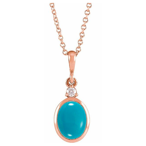 14k rose gold turquoise and diamond necklace has a spring ring clasp. 14k rose gold adjustable 16 to 18in cable chain. Turquoise is 8mm x 6mm. .03 carat round full cut diamond, G-H color, I1 clarity. Item approximate weight: 2.5 grams. Made in USA.