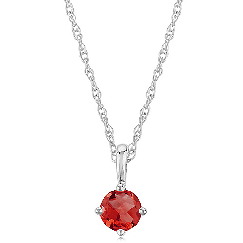 1/3 carat genuine round ruby solitaire necklace is made of 14k white gold. 14k white gold 18in loose rope chain has a spring ring clasp. Chain width: 0.6mm. One genuine round 4mm faceted ruby, A quality. Four prong setting. Approximate weight: 0.8 grams. Made in USA.
