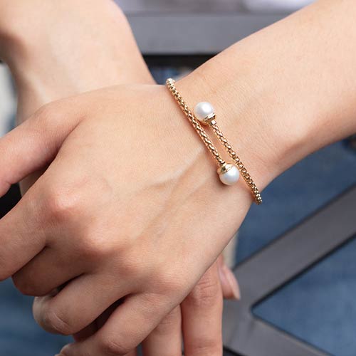 This slender 14k yellow gold popcorn bangle bracelet has two freshwater cultured pearls. 8.5mm round freshwater cultured pearls. Slip-on bracelet, one size fits most women. Approximate weight: 6.3 grams. Made in Turkey. Ships from USA.