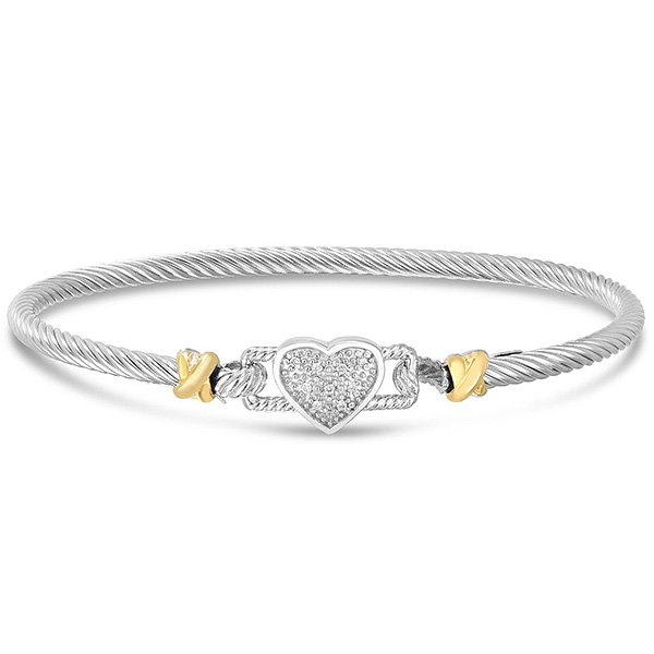 Phillip Gavriel sterling silver pave diamond heart cable bangle bracelet has two 18k yellow gold accents. Genuine round diamond accents, .045 carat total weight, H-I color, SI2-SI3 clarity. Bracelet length: 7in. Hook and clasp closure. One size fits most women. Made in Italy. Ships from USA.