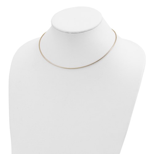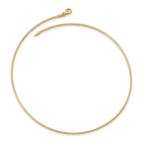Slender solid 14k yellow gold 16 inch omega chain has a polished finish and a lobster clasp. Thickness: 1.4mm. Approximate weight: 7.9 grams. Made in Italy. Ships from USA.