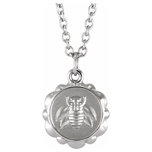 This very small 14k white gold bee medallion necklace has a bead blast and polished finish. Pendant size: 8.3mm without bail. 14k white gold 16in to 18in cable chain has a spring ring clasp. Approximate weight: 1.9 grams. Made in USA.