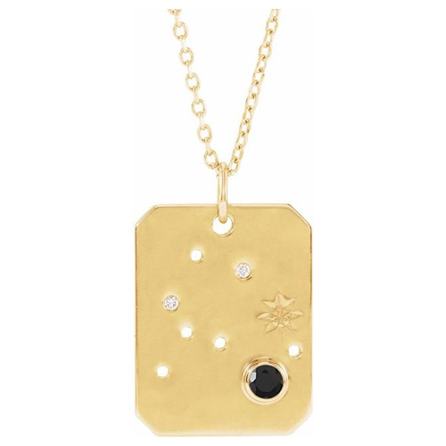 14k yellow gold Aquarius constellation necklace has a round black spinel and diamond accents. Rectangular pendant size: 1/2in x 3/4in. 2.5mm round black spinel. Two genuine round diamonds, .007 carat total weight, I1 clarity, G-H color. Made in USA.