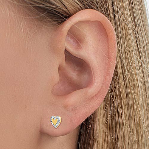 14 yellow gold heart shaped button earrings have a border of diamond accents. Earring size: 7.1mm x 7.1mm. Genuine round full-cut diamonds, 0.125 carat total weight, I2 clarity and H-I color. Posts with push on / pull off backs. Made in India. Ships from the USA.