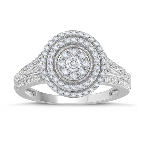 This exceptional Galaxie Solaire diamond ring is made of 14k white gold. The diamonds are placed on the ring using an exclusive composite setting technique to maximize brilliance and life. Genuine round full-cut diamonds, 0.50 carat total weight, I1 clarity and H-I color. Made in India. Ships from the USA.