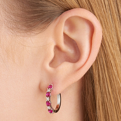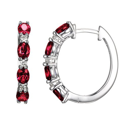 Created oval ruby and lab grown round diamond hoop earrings are made of sterling silver. These oval hoop earrings feature eight oval created rubies, 1.4 carat total weight. Six lab grown round full-cut diamonds, 0.12 carat total weight, I1 clarity, H-I color. Snap down closure. Import. Ships from USA.