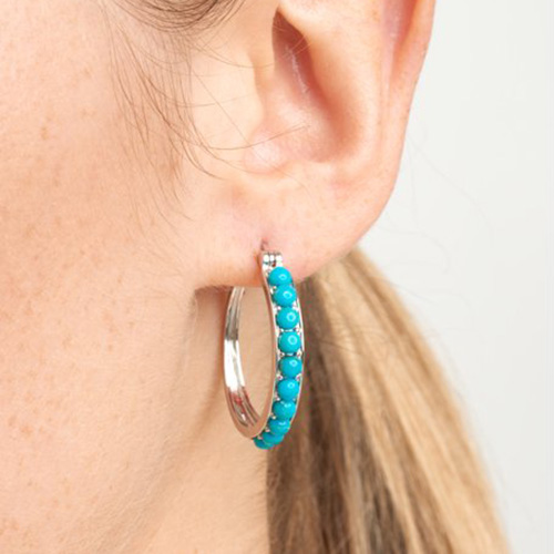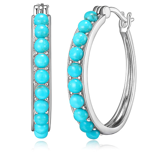 Genuine turquoise round hoop earrings are made of platinum-plated sterling silver. Earring length: 1 inch. Snap down closure. Ships in a black jewelry box with pouch. Import. Ships from USA.