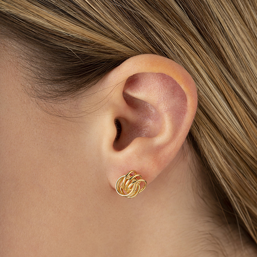 These 14k yellow gold coiled love knot earrings have a polished finish. Posts with push on / pull off backs. Item size: 0.3in x 0.4in. Approximate weight: 1.2 grams. Made in USA.