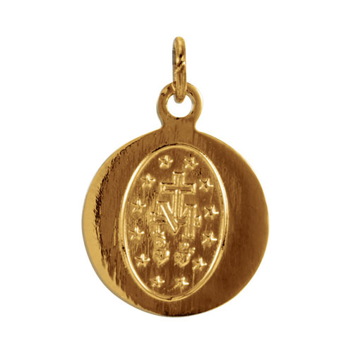 This tiny round miraculous medal charm is made of polished 14kt yellow gold. Perfect for children -- petite medal is 12mm in diameter. This item is half the height of a quarter. Inscription reads O MARY CONCEIVED WITHOUT SIN PRAY FOR US WHO HAVE RECOURSE TO THEE. Weighs 0.78 grams. Chain not included. Bail dimensions: 1.6mm x 2mm. We recommend a chain no wider than 1.25mm.