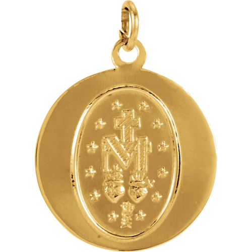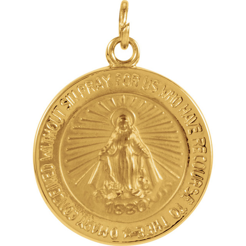 Round miraculous medal is made of polished solid 14k yellow gold. Perfect for children, this petite medal is 15mm in diameter. Inscription reads O MARY CONCEIVED WITHOUT SIN PRAY FOR US WHO HAVE RECOURSE TO THEE. Weighs 1.24 grams. Chain not included. Bail dimensions: 1.7mm x 1.75mm. We recommend a chain no wider than 1.5mm. Back of medal features an M, surmounted by a cross, with 2 hearts and 12 stars.