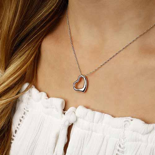 This solid sterling silver open heart necklace has that classic look that simply goes with every outfit. Pendant dimensions: 0.6in x 0.65in. Sterling silver 18 inch loose rope chain has a spring ring clasp. Chain width: 1.2mm. Approximate weight: 3.2 grams. Made in USA.