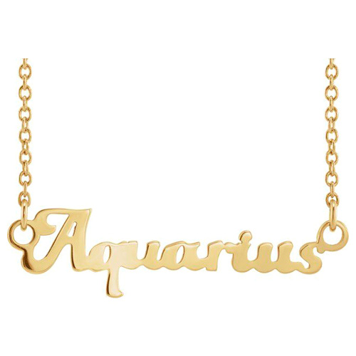 Aquarius zodiac sign nameplate necklace is made of solid 14k yellow gold. 14k yellow gold 18 inch cable chain has a spring ring clasp. Chain width: 1mm. Pendant width: 1 inch. Approximate weight: 2.1 grams. Made in the USA.