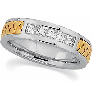 Polished 14kt yellow and white gold. Ladies' size 7 only. 5 x 2.5mm princess cut diamonds, G-I color, SI clarity. Weighs 9.80 grams.