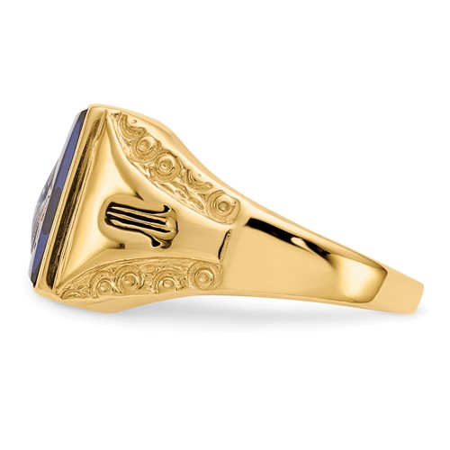 Closed back 10k yellow gold masonic ring has wide tapered sides. Plumb bob and trowel side emblems. Synthetic blue spinel stone is 12mm x 10mm. Ring size 10 weighs approximately 7.6 grams. Shank tapers to 2.5mm at the thinnest point. Standard fit. Made in USA.